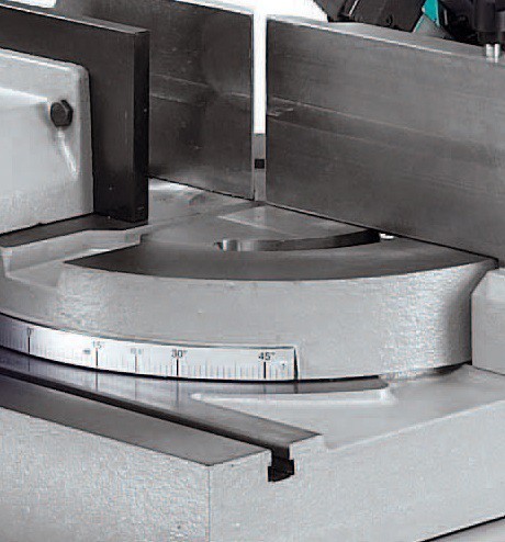 Huvudet girar från 0 till 60° vänster och 45° höger. Sågram i gjutet tubutförande. Bandspänning på 1700 kg/cm². Snabb inställning av det rullagrade bordet genom automatiska stopp vid 60, 45, 0, 45 grader. Justerbart koniskt rullager i sågramens lagertapp. Såghjulens diameter 320 mm. Växellåda arbetar i oljebad.