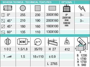 Halvautomatisk hydraulisk bandsåg, lämplig för kapning av solida material såväl som för profiler (stål, rostfritt, mässing, aluminium, koppar m.m.). Sågram i svetsat tubutförande. Bandspänning upp till2300 kg/cm². Snabb inställning av det rullagrade bordet genom automatiska stopp vid 60, 45, 0, 45 grader. Justerbart koniskt rullager i sågramens lagertapp. Såghjulens diameter 320 mm. Växellåda arbetar i oljebad. Hårdmetallstyrningar för sågbladet.